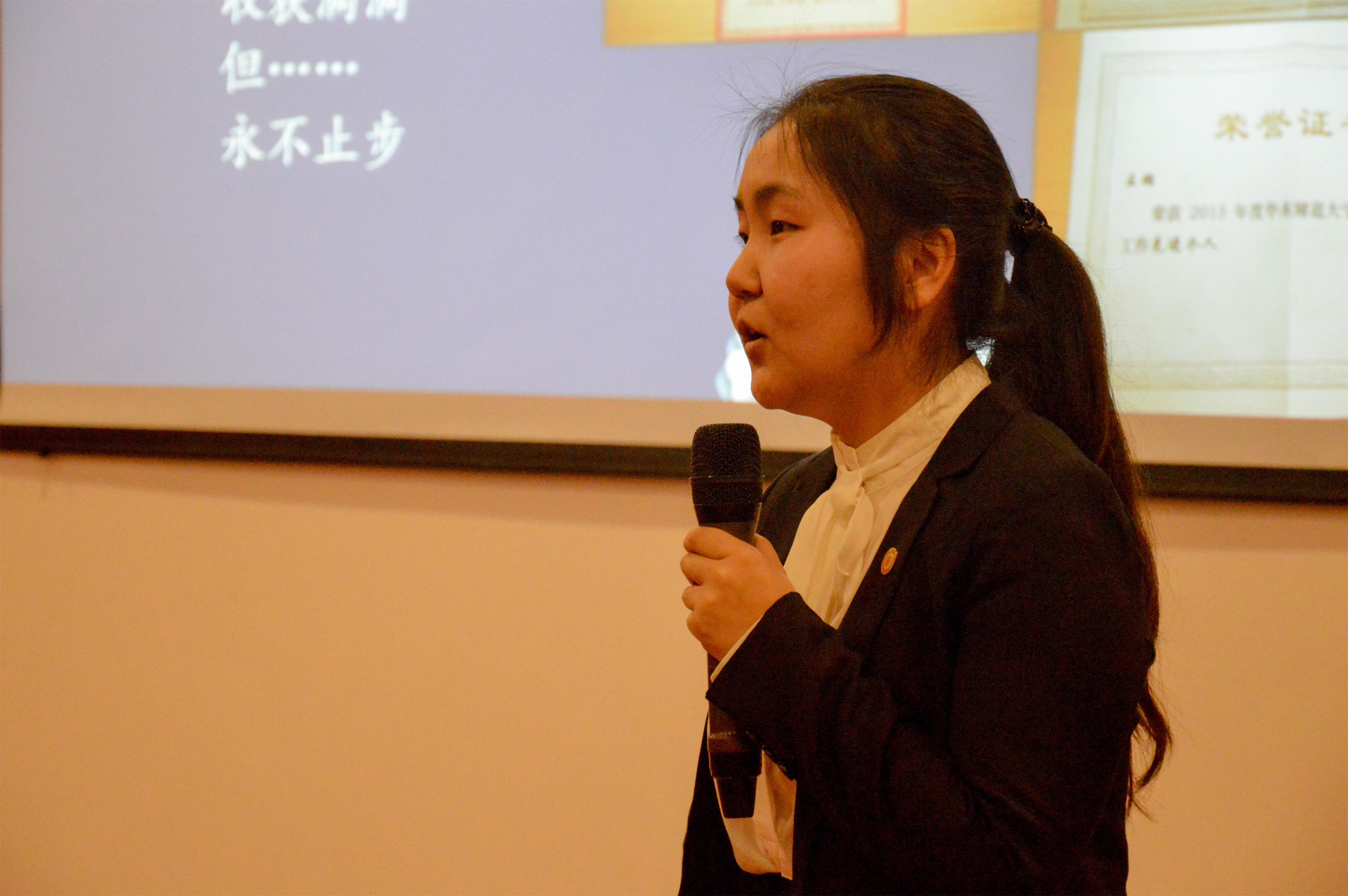 来自汉语言文学专业的尹慧枝从学业、工作、社会实践三方面讲述自己的故事。以公益作为自己的生活方式,以教师的身份时刻要求自己,就是这样一个一丝不苟的自己。她说只要细心经营自己的人生,人人皆可成为榜样。