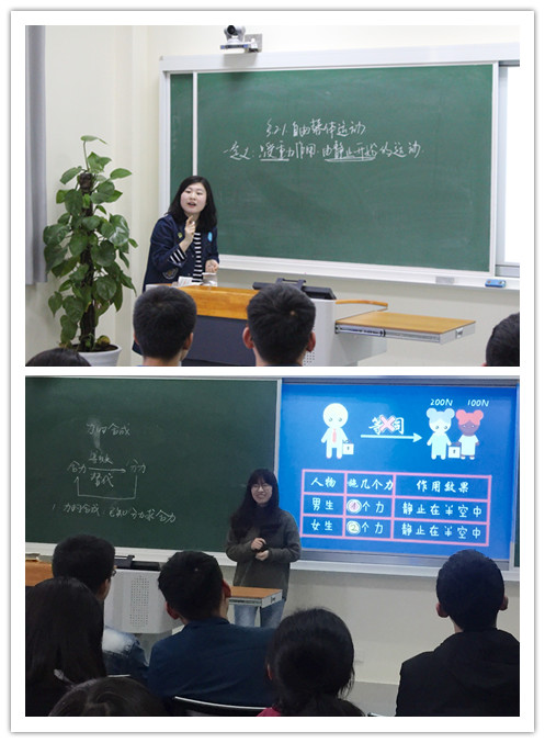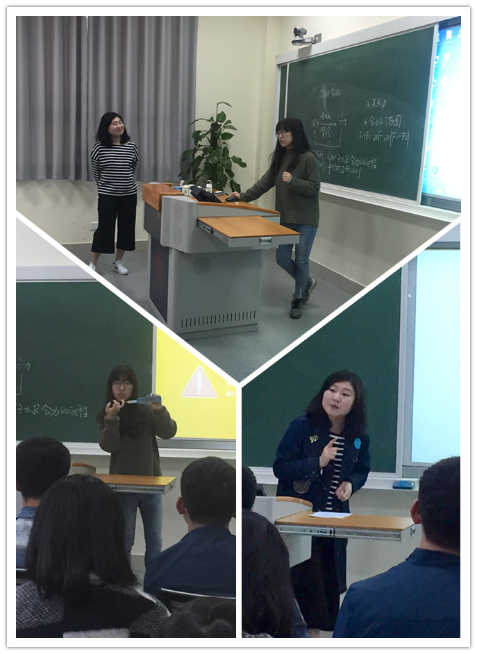 物理专场的两位学姐也进行了精彩的教学课展示,柳冠华学姐由生活实例导入课堂主题—“物体的自由落体运动”,并通过详细的分析引导学生思考得出结论,让听者体验了一堂不同寻常的物理课。紧接着上台的顾千红学姐,利用经典的物理实验,由实验结果引出定理,讲述力的合成。听众们专注听取学姐们授课经验的分享,汲取经验教训。