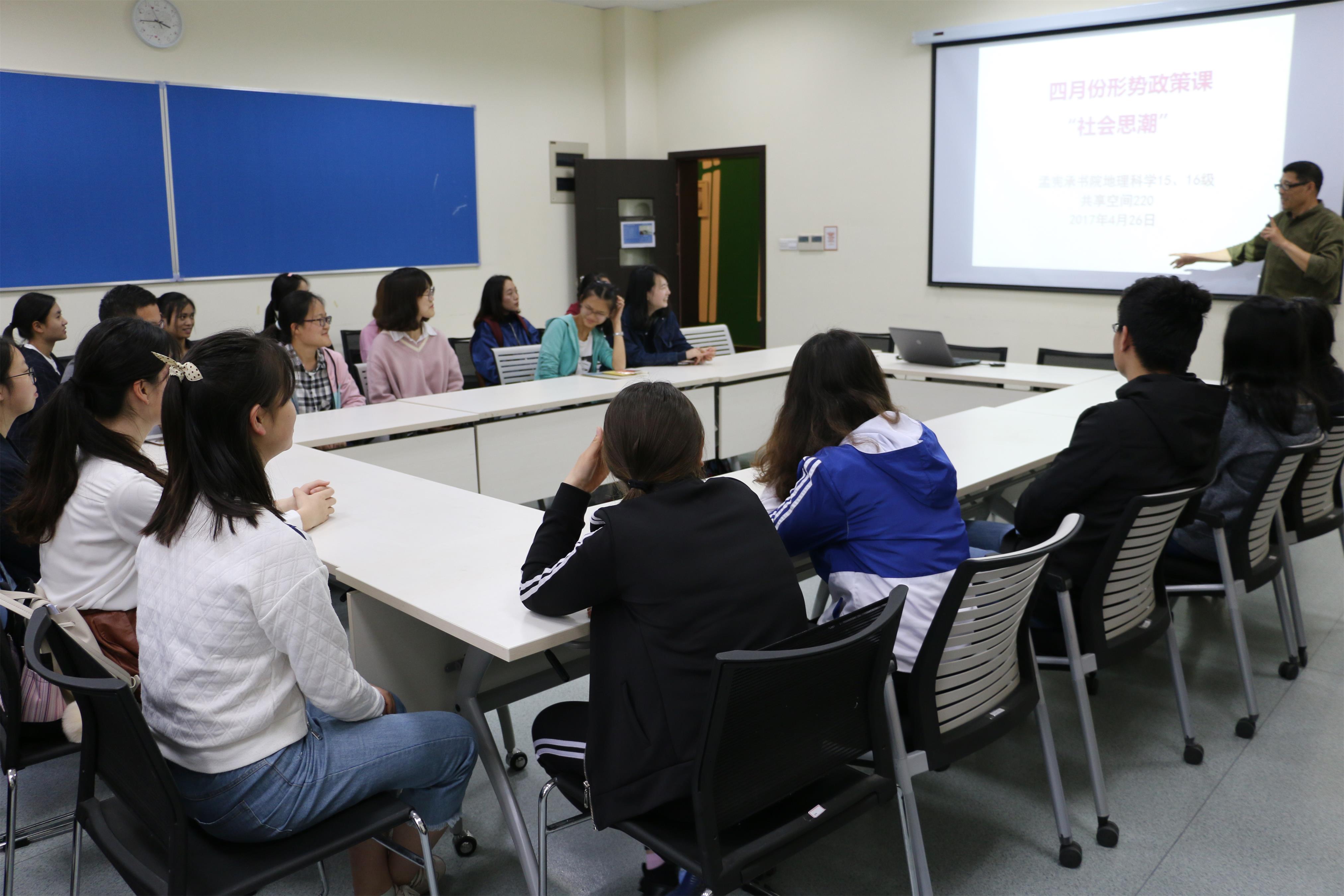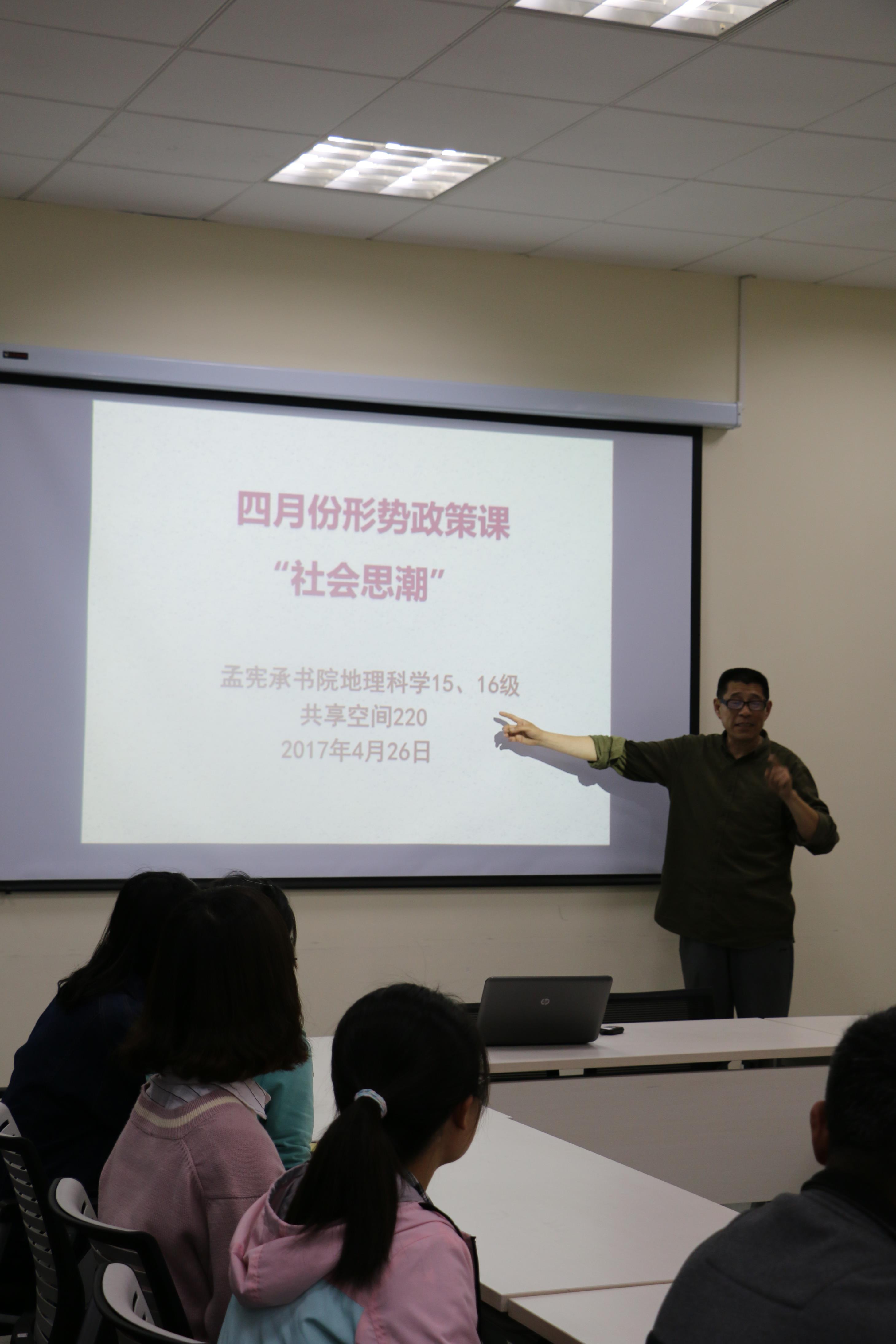 2017年4月26日下午三点半,孟宪承书院地理科学15、16级学生在共享空间220进行了本学期第二次形势政策课的学习,本次学习由辅导员益建芳老师来主持。