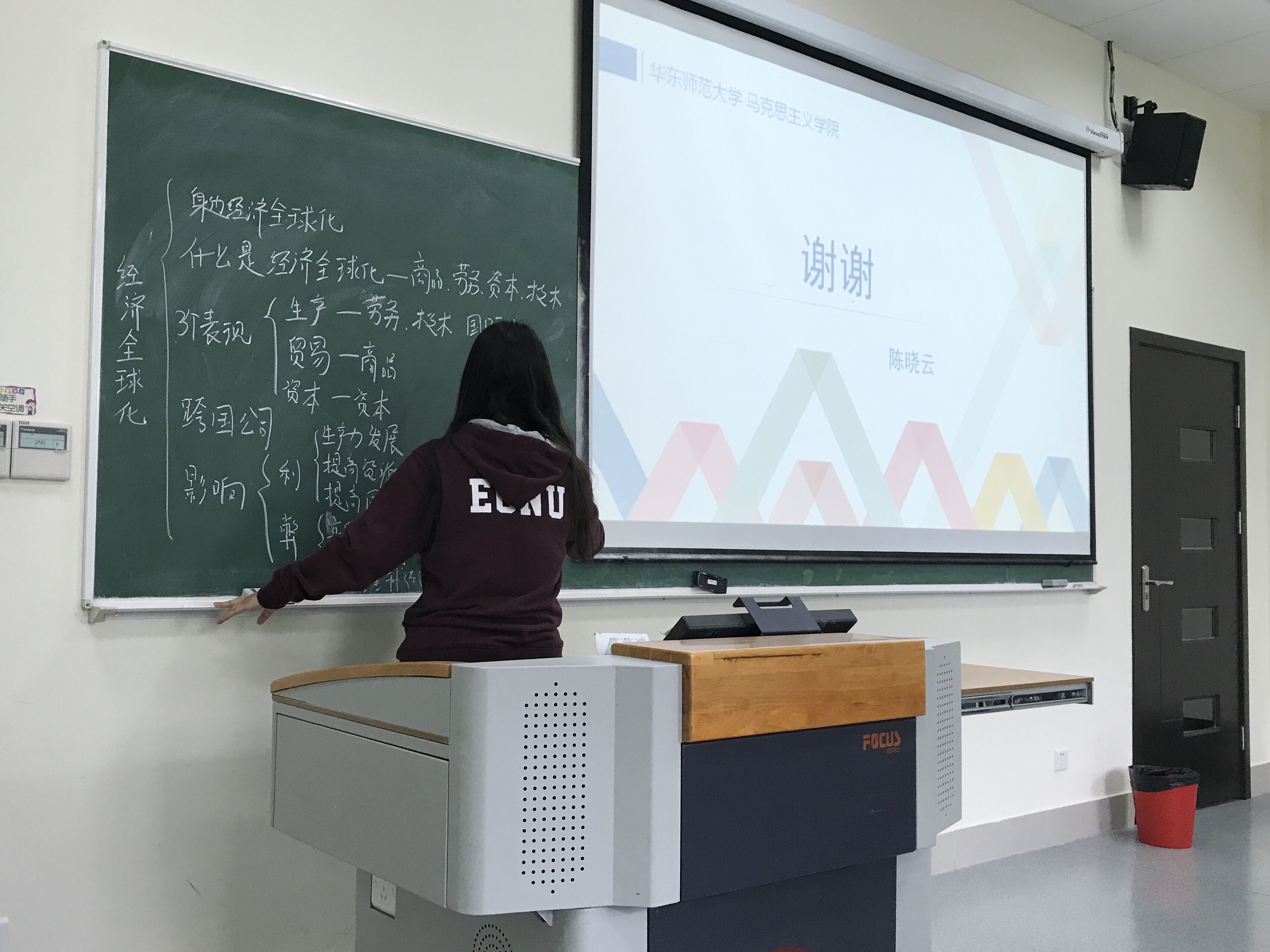 接下来讲课的是陈晓云老师。陈老师以一个问题开头:“现在我们要买一个进口的产品难吗”,同学们纷纷表示很容易。她顺此话题引出本课主题:“经济全球化”。她举出中国畅销海外的系列产品,讲出经济全球化的定义。接着,陈晓云老师讲述了经济全球化的3个主要表现——以飞机的制造、福特汽车、耐克鞋的生产阐述“生产全球化”;以麦当劳、苹果手机为例子解释“贸易全球化”;最后,陈老师以跨国公司(阿里巴巴)为例向同学们讲述了“资本全球化”,并为同学们区分了“资本国际化”与“资本全球化”的区别。接着,陈老师又询问了同学们对经济全球化的态度和看法,引出经济全球化的双刃剑性质,并强调在经济全球化的今天,全球的两极分化依然非常严重。顺此内容,她提出发展中国家在经济全球化的今天应该采取的对策。最后,陈老师脱离PPT,在黑板上板书,和同学们回顾了本堂课的知识结构。