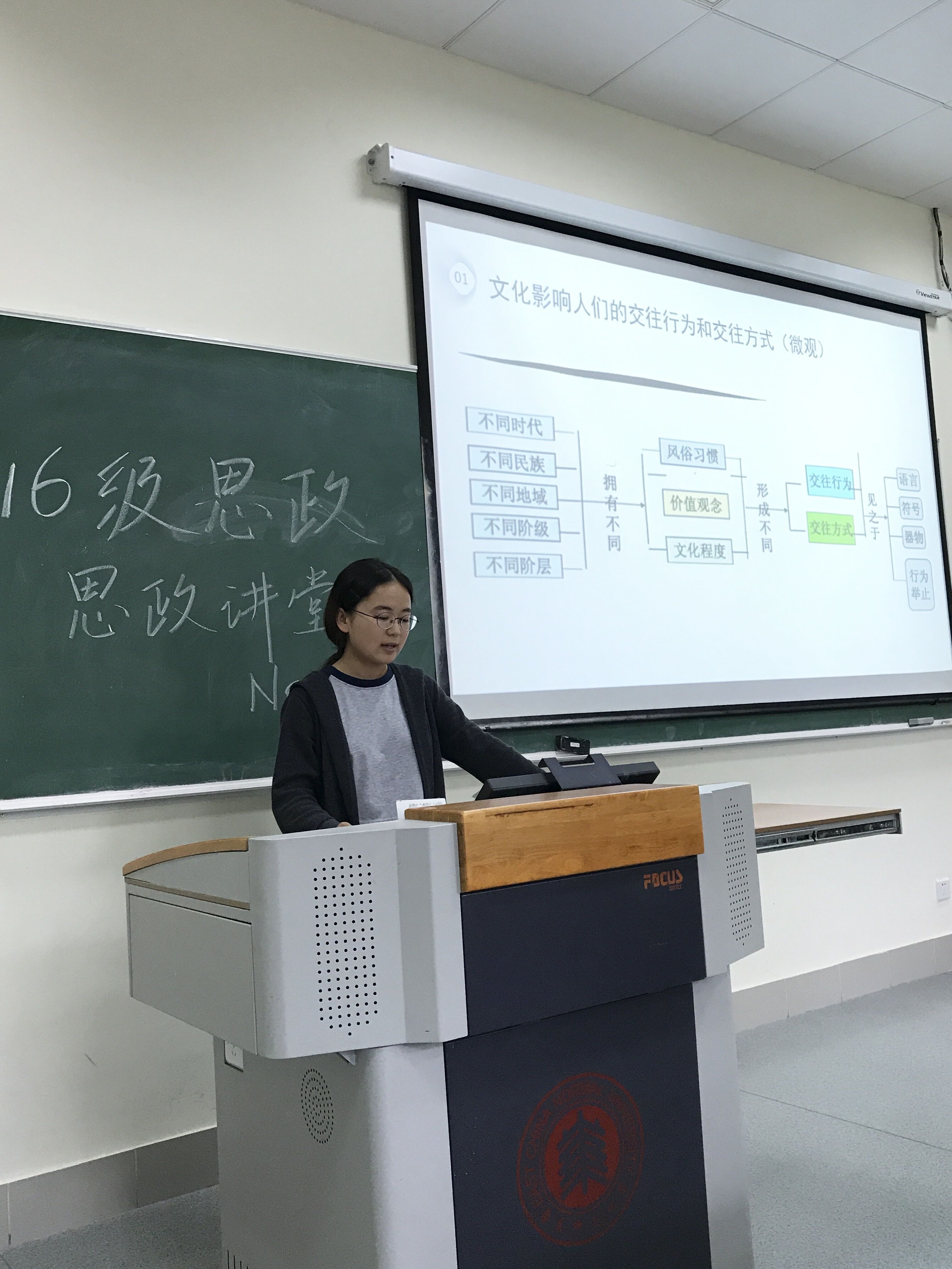 首先讲课的是王燕老师。王燕老师讲述的主题是“文化生活——文化对人的影响”。她首先以生活中我国南北方的巨大文化差异为切入点,吸引同学们的注意。接着她谈到多样性的文化、不同的文化的环境对人产生不同的影响,由此引出本课的主题“感受文化影响”。接下来,王燕老师分别以事例和小问题穿插的形式为我们讲述了文化影响人的来源、文化影响人的表现,文化影响人的特点,并且重点提出了优秀文化对人的影响。同时,王燕老师用课堂小题为辅导,检验同学们的听课成果。最后,王燕老师以一个简明的结构框架对本课进行了总结。