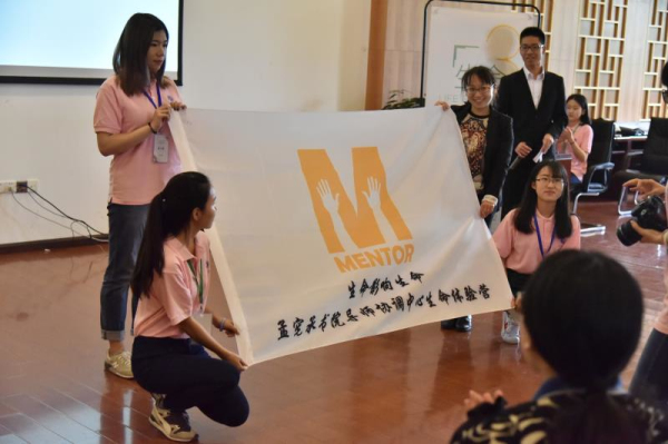 各小组找到自己的队友后返回共享空间202,在主持人温馨的开场之后便迎来了激动人心的开营仪式,由孟宪承书院党委副书记杨艳红老师致开营辞并进行授旗,杨老师通过简明扼要的几个关键词向16级的同学们介绍书院与通识教育、导师与生命教育以及转型中的孟宪承书院和营员们拟从事的朋辈导师。