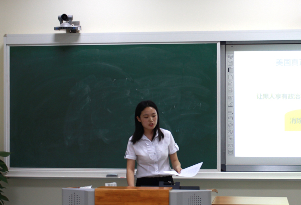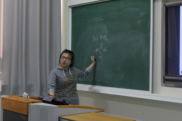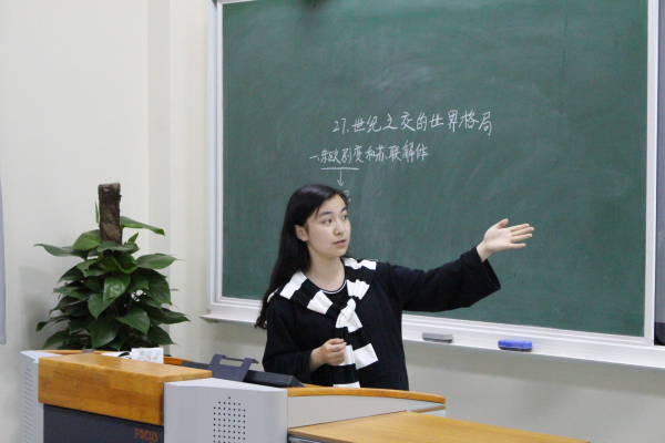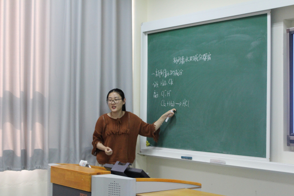 数学专业的张玥讲解了等差数列。由身边中常见的等差数列的数据切入,将枯燥的数学概念生活化,便于学生们理解与结合实际举一反三。来自化学专业的陈茹婷探究了新制氯水的成分。板书工整,思维严谨,不同实验现象的图片展示生动形象,使这节化学课更加丰富直观。数学专业的孙愉讲述了直线和平面垂直的判定定理。数学中理性推理剖析的魅力在其讲解中展现的淋漓尽致,一步步的归纳总结又让人深刻体会到逻辑思维的张力。地理科学专业的林钰铮主讲上海地区,运用其专业知识剖析了城市化的进程。