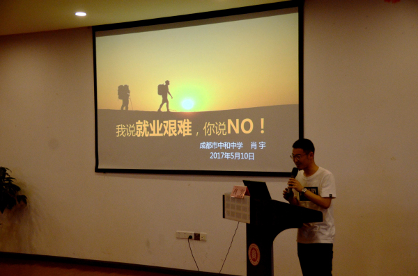 开场,肖宇学长以幽默、诙谐的语言带动着会场的氛围,顿时间其乐融融并带着大家以轻松愉快的姿态深入到报告中去。首先肖宇学长简述其充满着传奇的就业经历,四下重庆,四入川府,终于赢得了众多学校投以橄榄。在书院党委书记兼院长在就业动员上所讲的真理——合适得才是最好的,以及践行自己许下的诺言,婉言谢绝其他优秀学校的盛情,毅然选择了四川成都中和中学。