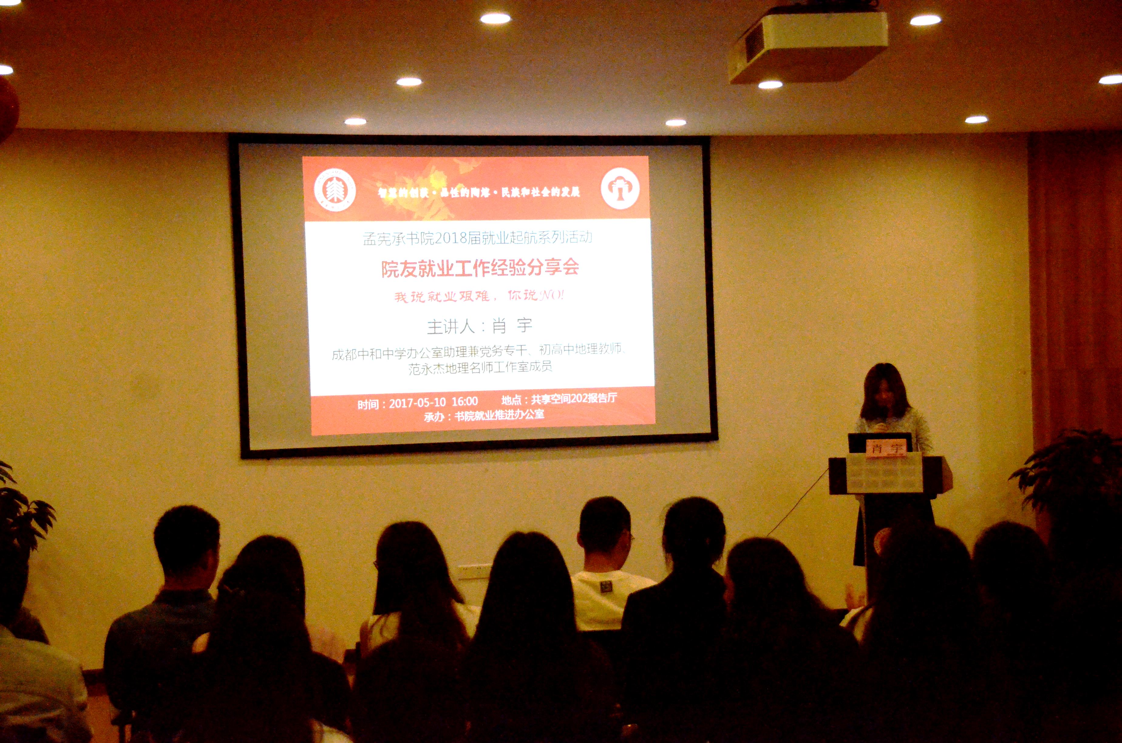 自从孟宪承书院就业服务月启动以来,相继开展了多场就业系列活动。孟宪承书院于5月10日邀请了2016届优秀院友肖宇学长,与孟宪承书院的学子们分享就业工作经验。14级思政专业王子璇同学担任本次大会的主持,向与会的同学们介绍肖宇学长的光辉历程。