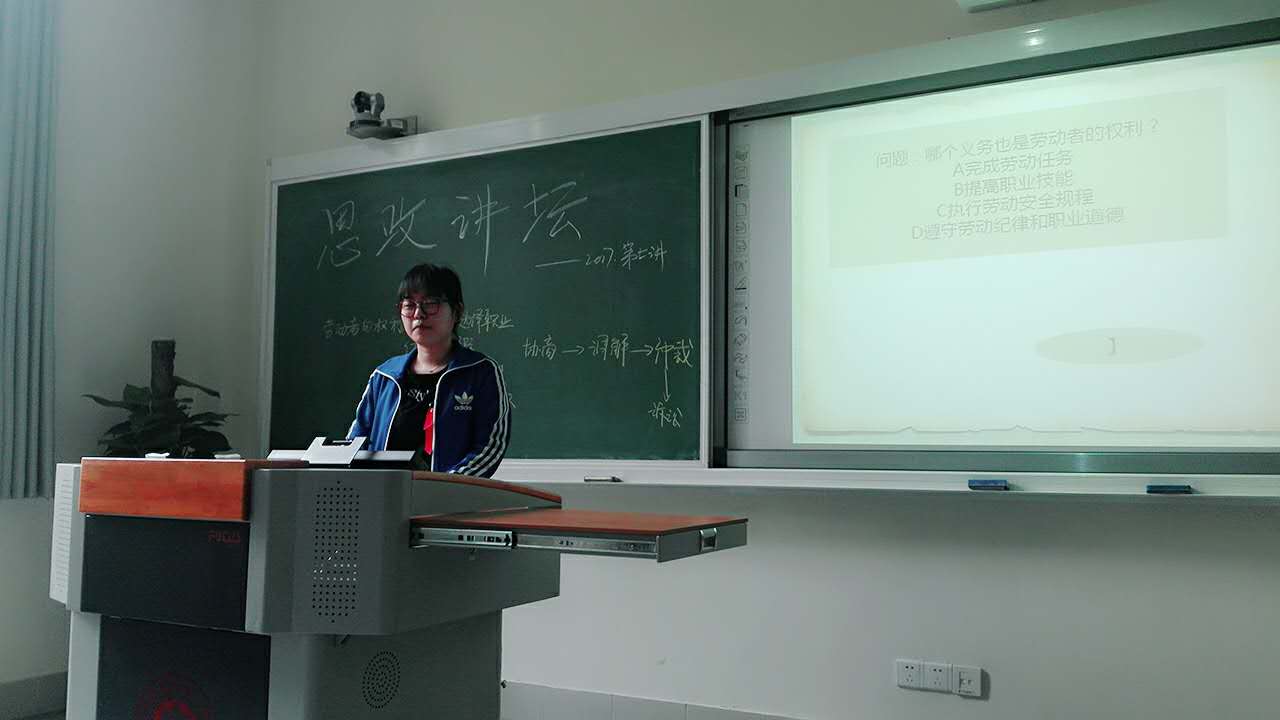 彭老师此次授课的内容是《劳动者的权利 平等就业选择观》。彭老师首先举出了我国劳动者享有的各项权利,利用生活中的案例来详细解释了这些权利,并以虚拟人物方方的一系列遭遇让同学们对于这些权利有了深刻认识。然后,由“如何保障劳动者的合法权益”引出 “劳动合同法”的内容。并讲述了劳动者应该通过协商、调解、仲裁、诉讼四个递进的程序来具体维护自己合法权益。