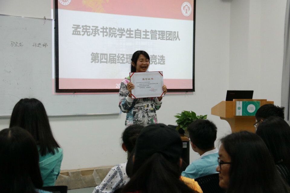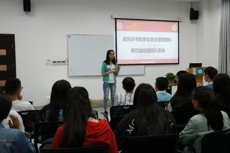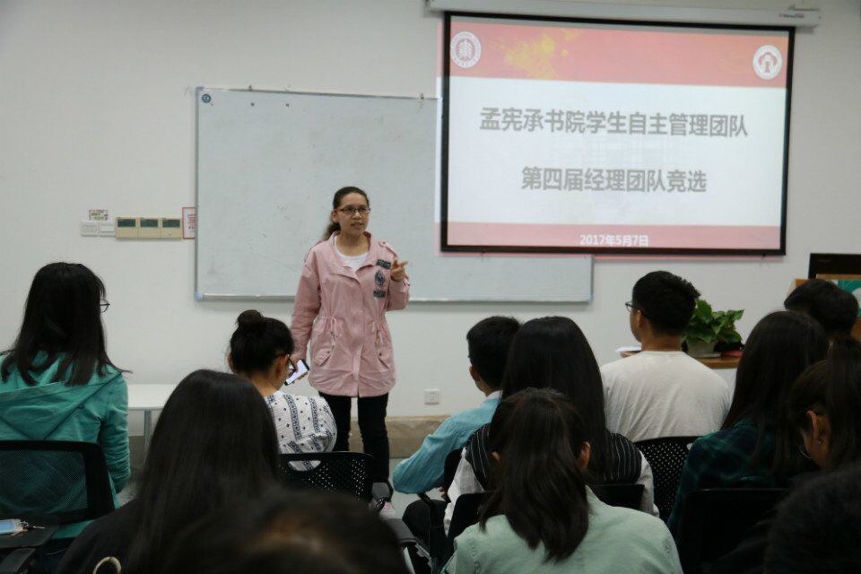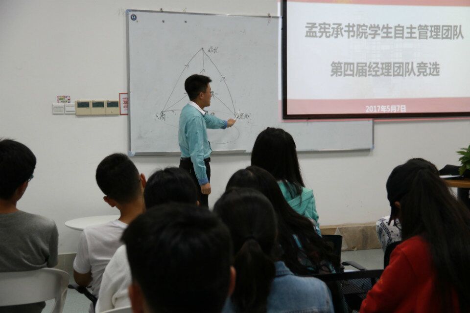 2017年5月7日晚,孟宪承书院学生自主管理团队第四届经理团队换届竞选大会在学生共享空间302举行,团队全体成员和指导老师苏振兴一起参加了活动。