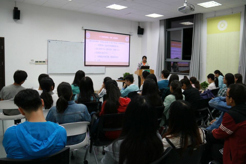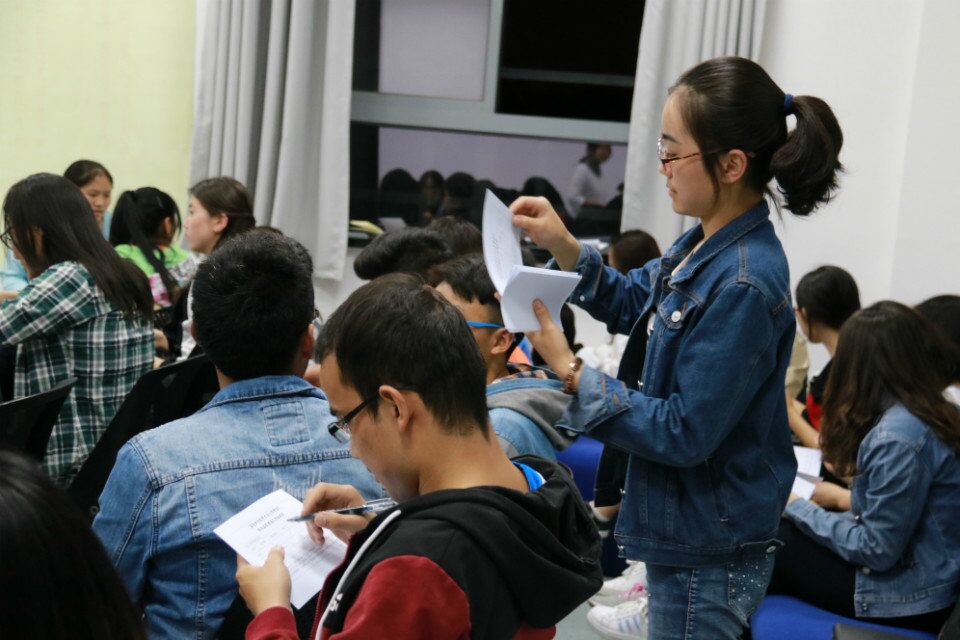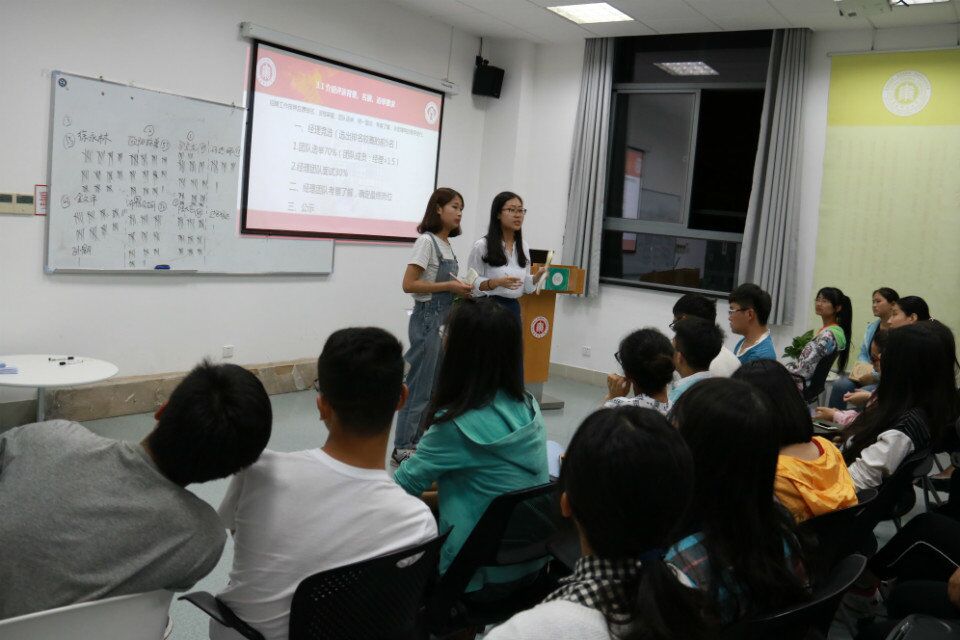 第二位是欧阳艳碧同学,她大方自信的走上讲台中央,向同学们讲述了自己的基本情况,她还通过讲述工作中遇到的两个故事来阐释学生自主管理团队带给她的成长与进步。