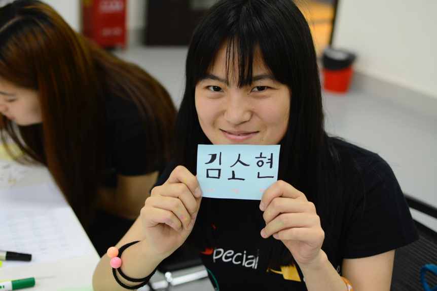 参与活动的同学们亲手在便利贴和精心挑选的明信片上写出自己喜欢的韩国艺人的名字,并且由小组成员教授正确读音。能够亲手写出偶像的名字和亲口说出自己的喜爱之情,参与的同学们都十分开心激动,现场一片欢声笑语。墙上也贴满了同学们亲手写下的偶像的名字,一笔一画中都是纯粹的喜爱。