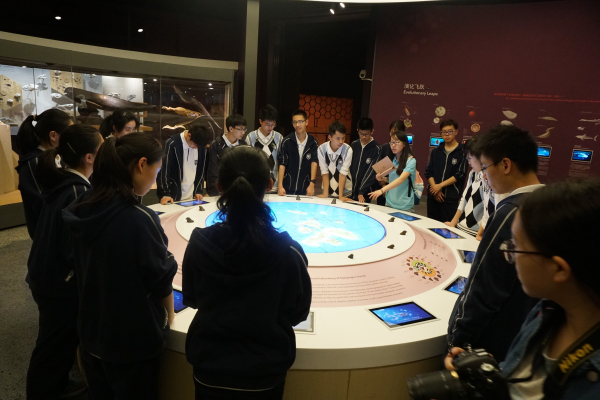 最后,我们来到了“演化之道”展区的“达尔文中心”。张秋荣同学以“有无相生”引入达尔文进化论,讲述了达尔文的“贝格尔号”航行的有趣故事,激起同学们极大的兴趣。最后,她还结合历史、宗教、哲学知识阐释了达尔文进化论的影响,引起了同学们的深刻思考。