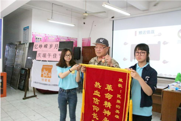 9点30分,活动正式开始了。本次活动的主持人为历史系的王丝语同学以及社区工作者斌哥,在简短又不失温情的开场白中,大家以热烈的掌声欢迎了参与本次活动的功臣老兵及家属们、吴泾镇居委会书记何正其先生、镇分管双拥的民政干部魏兆梅女士以及少先队的小朋友和父母。