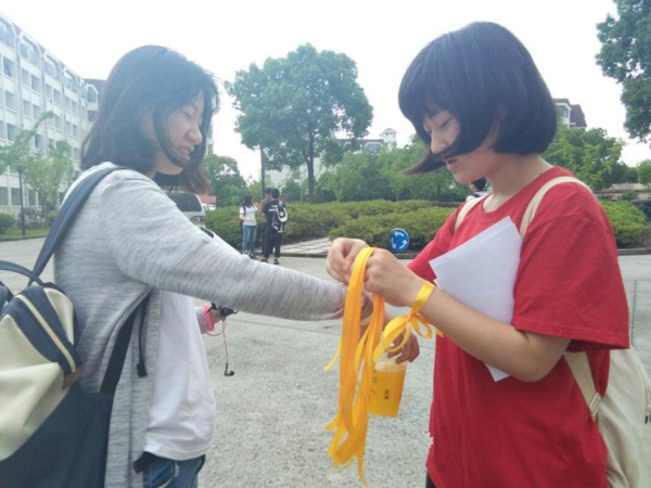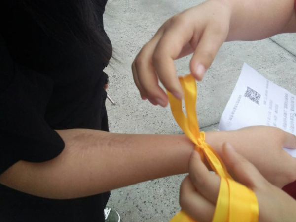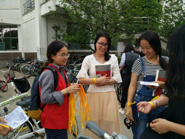 从河西食堂至河东食堂,志愿者们分散在这一路上,热情地为沿路的同学介绍此次活动,并向他们发放活动的宣传单。同学们了解活动后,志愿者们将手上象征着平安的美丽的黄丝带轻轻地系在同学的手腕上。与此同时,志愿者们再次温馨地叮嘱同学:“走路不要玩手机哦,如果愿意,可以将这小小的黄丝带传递下去,提醒更多的同学。”