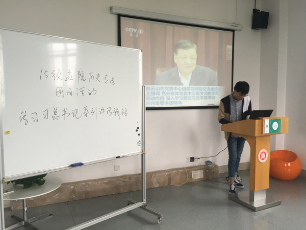 五月二十四日下午,15级孟院历史专业的同学在共享空间顺利的举行了本月团日活动:观看习主席系列讲话并学习其中精神。2014年10月23日,“深入贯彻习近平总书记系列重要讲话精神”首次被写入最高规格的十八届四中全会公报。至此,“习近平总书记系列重要讲话”渐成专属名词。习近平总书记系列重要讲话有“一个中心、两个基本点”。“一个中心”即实现中国梦,“两个基本点”即全面深化改革和坚持群众路线。
