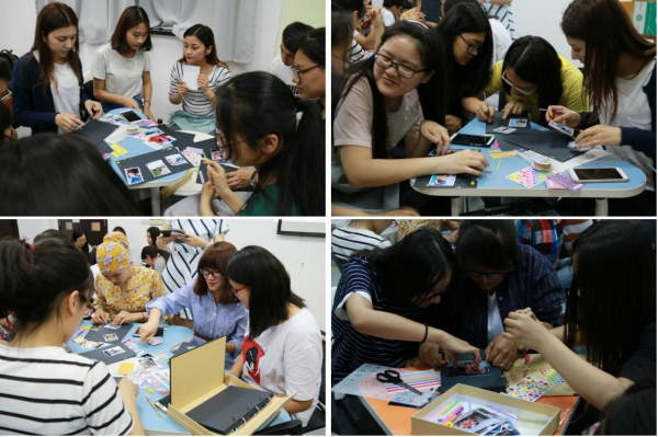 之后,在悠扬的背景音乐下,各个小组热火朝天地开始动手制作小组的纪念相册。