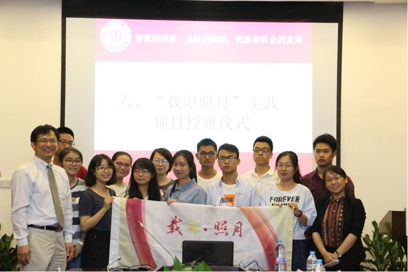 紧接着,胡宏昌先生和书院老师为“载阳照月”项目组授予实践旗帜。胡宏昌先生对新的项目组表示肯定并寄予极大的期望,感恩同学们回馈家乡的情怀,祝福同学们实践顺利。