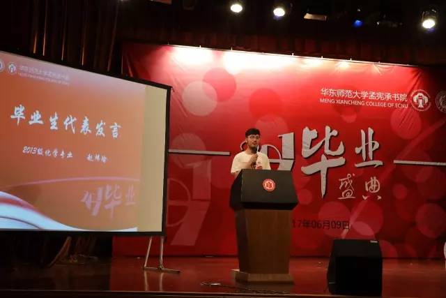 紧接着,13级化学专业的赵炜瑜同学和13级思政专业的郑宇琪同学作为毕业生代表上台发言。他们分别回顾了自己四年的大学生涯,也对未来饱含崭新的期待。