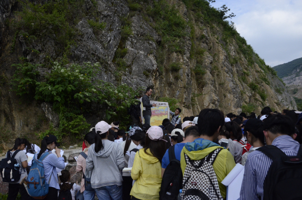 今天最后一个实习地点是棒锤山(西侧),同学们从山底往上走,可以看到岩石粗细的变化以及不同地质年代的不同岩石类型及产状。这些拓宽了同学们的视野,加深了对于书本上知识的理解。