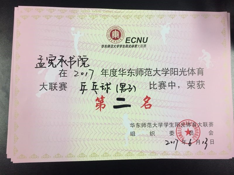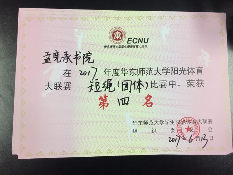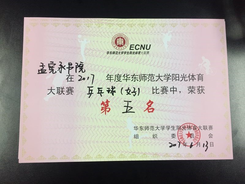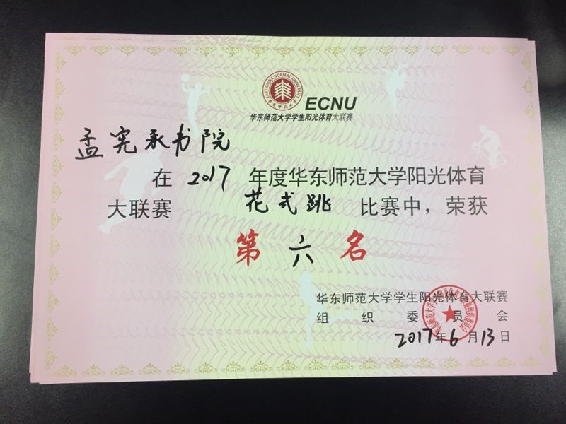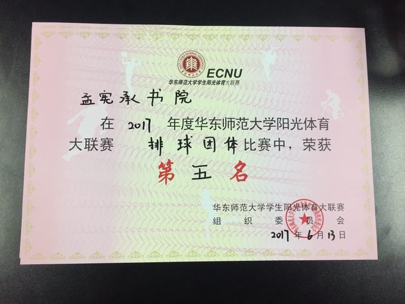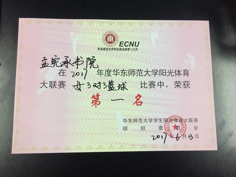 2017年6月14日,长达两个月之久的阳光体育联赛终于落下帷幕,并在华东师范大学闵行校区东操场举办了闭幕式。在本次阳光体育联赛中,孟宪承书院的运动健儿们奋力拼搏,斩获3V3女子篮球第一名、乒乓球团体赛第二名等奖项。