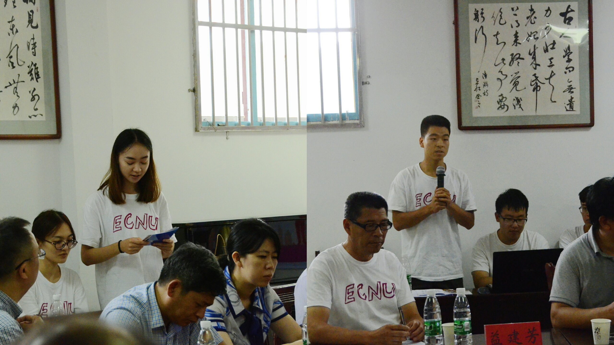 接下来的座谈发言中,本次支教活动的队长、孟宪承书院2015级思想政治教育专业的张静帆同学和成员李楠同学对支教队伍组成、爱心学校课程设置、社会调查设计等情况进行了介绍,并表示将努力在两周的教学中和学生们共同成长进步,同时深入调研了解老区的教育和社会生活现状。之后孟宪承书院副院长苏振兴老师发言,他介绍了此次实践的准备情况,并表示能够在红色之源的葛源进行实践活动是一次非常珍贵的锻炼机会,他代表实践队向当地师生表示感谢,并表达了全力以赴办好暑期学校,积极为老区服务并努力吸取红色基因的决心。