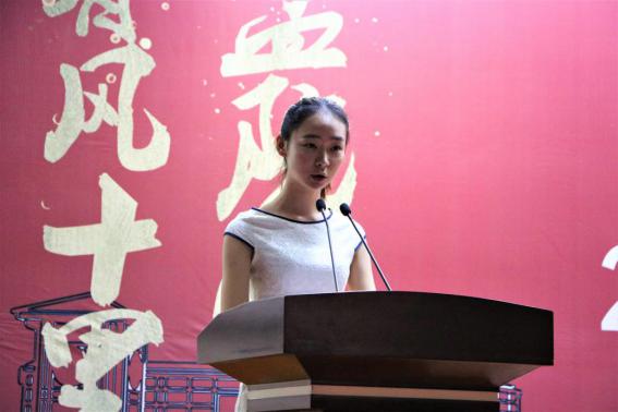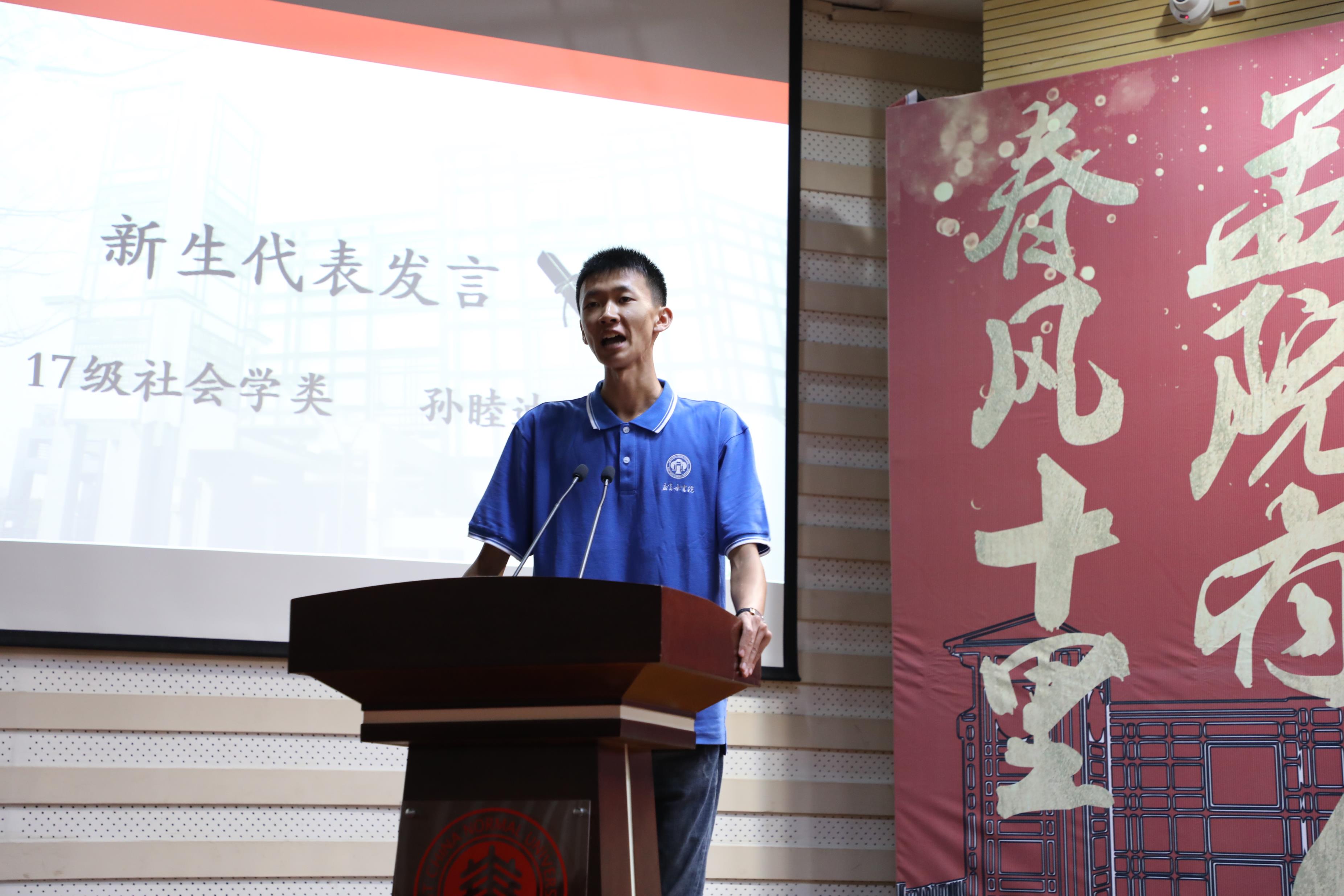 15级思想政治教育专业张静帆学姐上台发言欢迎新生的到来,她致语道:“愿你们始终有顺应世界的坚忍和改变世界的雄心。你若盛开,清风自来。”随后,新生代表17级社会学专业孙睦迪同学上台表达了他对大学生活的憧憬,面对全新与未知的一切,他高呼道:“路上风光正好,天上太阳正晴。”孟想相传,与尔同新。