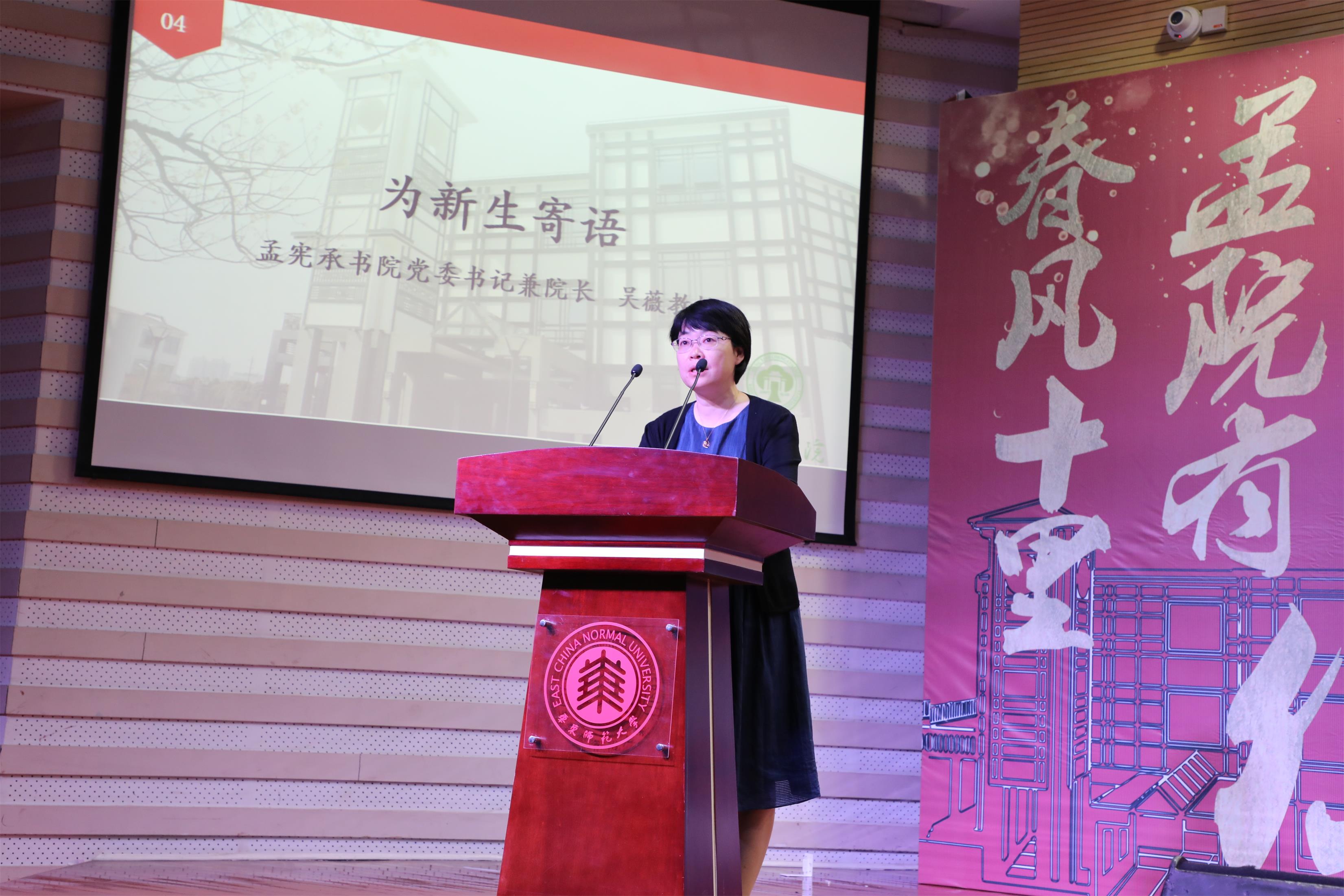 在全体新生的掌声欢迎下,书院党委书记兼院长吴薇教授致新生欢迎辞。十年孟院,岁月沉淀,气韵自芳华,如今迎来了全校书院制改革的新契机。在博采众长的书院制度下,在多元文化的学习体验中,书院学子应充分利用丰富的资源,积极参与实践活动,努力提升自己的全面素质。院长的教诲,似春风沐霖,新生们也踌躇满志,心潮澎湃,立志在勤于学习,敏于求知;勤于修身,勇于担当;勤于实践,善于笃行这三点要求下,在“智慧的创获,品性的陶熔,民族与社会的发展”的成材标杆下,砥砺前行,完满自我,最终成为代表孟宪承书院卓越进取形象的新一代书院人。