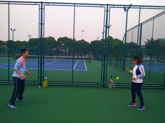 之后组长认真仔细地教授网球的正反手基本动作,主动给新成员喂球,训练成员的正反手击球能力。在经过两组训练后,组员们开始了对打训练。