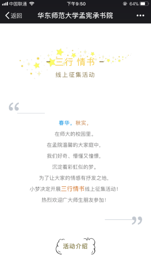 2017年9月18日,由孟宪承书院文化建设中心举办的三行情书线上征集活动以公众号推送的形式开展。本次活动旨在给孟院全体相关成员提供一个情感抒发的平台。同学们以一封封轻松写意且带着书院式文艺气息的三行情书将自己对学校,对书院,对身边师友的深情厚谊诉诸笔端,渲染以墨色。