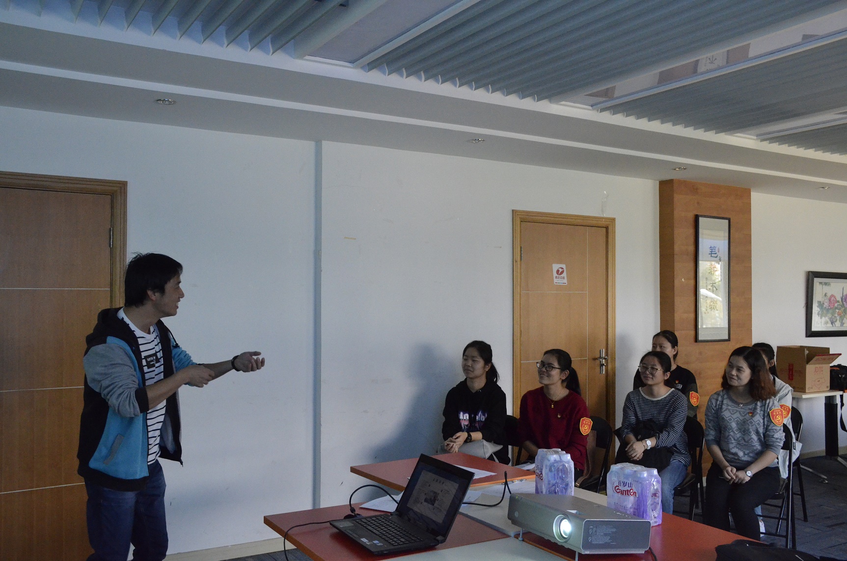 闵行区吴泾拾星者社会工作服务中心的翁斌老师向学生党员介绍探访工作