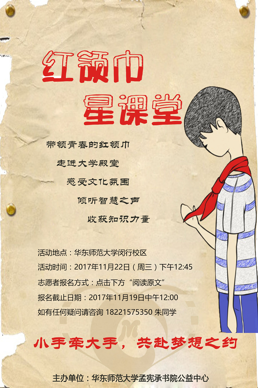 志愿者招募 |“红领巾·星课堂8.0”活动志愿者招募 “昨天的潇洒少年郎,今日已变成大人样……”迎着冬日的暖阳,浅斟低唱着,恍惚间,那些懵懂无知的岁月,那个青涩稚气的自己历历在目,一个个成长的足迹堆叠蔓延,铸就了这成熟内敛的模样。年复一年,无数稚嫩天真的心灵仍在逐梦道路上勉力奋斗,你是否愿意牵起那一双双娇小的手,为他们指引前行的方向? “红领巾·星课堂”活动作为一座连接梦想的桥梁,一个展示风采的舞台,现诚邀耐心、有爱、自信的志愿者参与我们的活动,与小学生们分享各自的梦想,展示自己的才能,同他们一起领略师大的别样风采,用自己的行动为小学生,也为自己留下一段美好、难忘的记忆。 “红领巾·星课堂8.0”活动 将招募志愿者20人 1.活动地点:华东师范大学闵行校区 2.活动时间:2017年11月22日(星期三)12:45-16:00 3.报名方式: 点击下方阅读原文,填写问卷。 4.截止日期:2017年11月19日 中午12:00 5.注意事项: (1)热情、耐心、细心并要富有奉献精神和责任意识,保证活动过程中小学生的行进秩序和安全问题。 (2)11月21日(周二)晚21:00在20号楼118房间进行志愿者培训,请注意是否能够参加。 (3)录取规则:优先录取能参加11月21日(周二)晚培训的志愿者,原则按照报名时间先后进行录取。 (4)志愿者应在活动前及活动中服从负责人管理,按照活动时间到达相应地点。 (5)被录取的志愿者将于11月20日中午之前以短信方式通知。 (6)如有任何疑问请咨询18221575350朱同学。