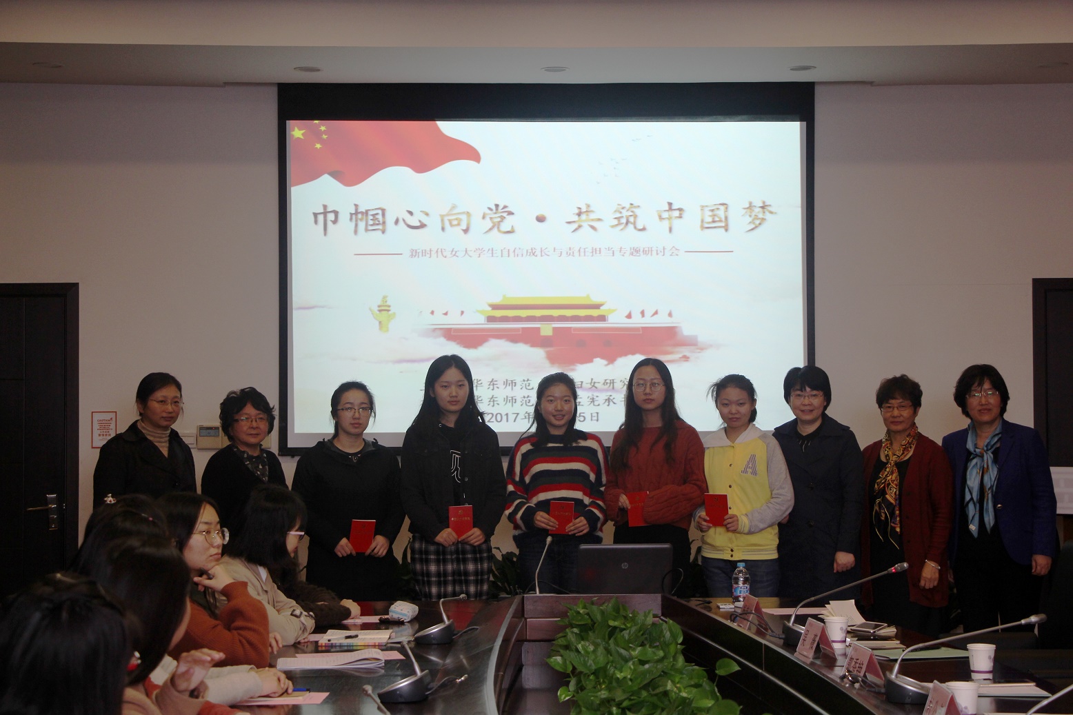华东师范大学妇委会常务副主任杨素华老师在会中致辞 在主旨报告环节,吴瑞君教授作了题为《青年人的新时代、新思想、新征程——学习十九大精神》的演讲。吴瑞君教授结合十九大报告的学习体会辩证地阐述了新时代和青年人的关系:新时代赋予青年人更美好的生活,也赋予青年人更重要的使命;青年人既是实现目标的主力军,也是目标实现的受益者。吴瑞君教授指出,女性在新时代要直面多种社会角色的冲突,准确定位做好规划,坚持不懈地学习,珍惜管理好时间,做自尊、自强、自立的新女性。 华东师范大学社科处处长吴瑞君教授发言 随后,郭秀艳教授结合自己的成长成才轨迹,分享了从学生到教师职业人转换过程的心路历程,特别强调了时间对为学和为人的重要性。郭秀艳教授非常重视女性个人价值观的塑造,提出在新形势、新环境、新时代的多元背景下,价值观的塑造是女性人格独立、女性价值创造、女性社会价值实现的前提和基础。 华东师范大学心理与认知学院副院长郭秀艳教授发言 互动研讨环节,与会三位专家从女大学生如何加强自我修炼适应环境、如何健全人格承担育人职责、如何面对性别差异实现人生价值等方面与学生沟通交流。杜公卓教授指出,新时代下个体与环境的和谐发展需要个体的能动适应与调整,需要具备戒骄戒躁、扎实稳健的心态。杜公卓教授进一步鼓励书院的女大学生好学、勤学、善学,拥有足够的知识储备和技能锻炼以更好地适应社会。 孟宪承书院党委书记兼院长吴薇发言 学生代表提问 与会师生现场交流 原华东师范大学党委副书记杜公卓教授总结发言 与会教授一致认为,女性会经历不同的生命历程和角色,作为新时代的女性要定准重要角色、抓住主要矛盾、学会时间管理,以健康和积极的状态积极践行自立、自强、自尊、自爱的精神,成就最好的自己。研讨会尾声,嘉宾向与会学生代表赠送了新修订的《中国共产党章程》。 与会嘉宾向学生代表赠送新《党章》 与会师生合影 此次研讨会以深入领会和贯彻学习十九大精神学习为主线,以专题研讨、师生活动的形式,通过专家解读、经验分享、观点碰撞、问题解惑,融学习与贯彻十九大报告精神于青年学生的日常学习成长与优秀女教师的榜样先锋示范中,价值素质与思想引领基于日常生活、贴近学生实际,与会师生普遍反映受益匪浅,进一步明确了新时代、新征程的新特点和新要求,以及作为青年学生和教育者的重要使命与责任担当。