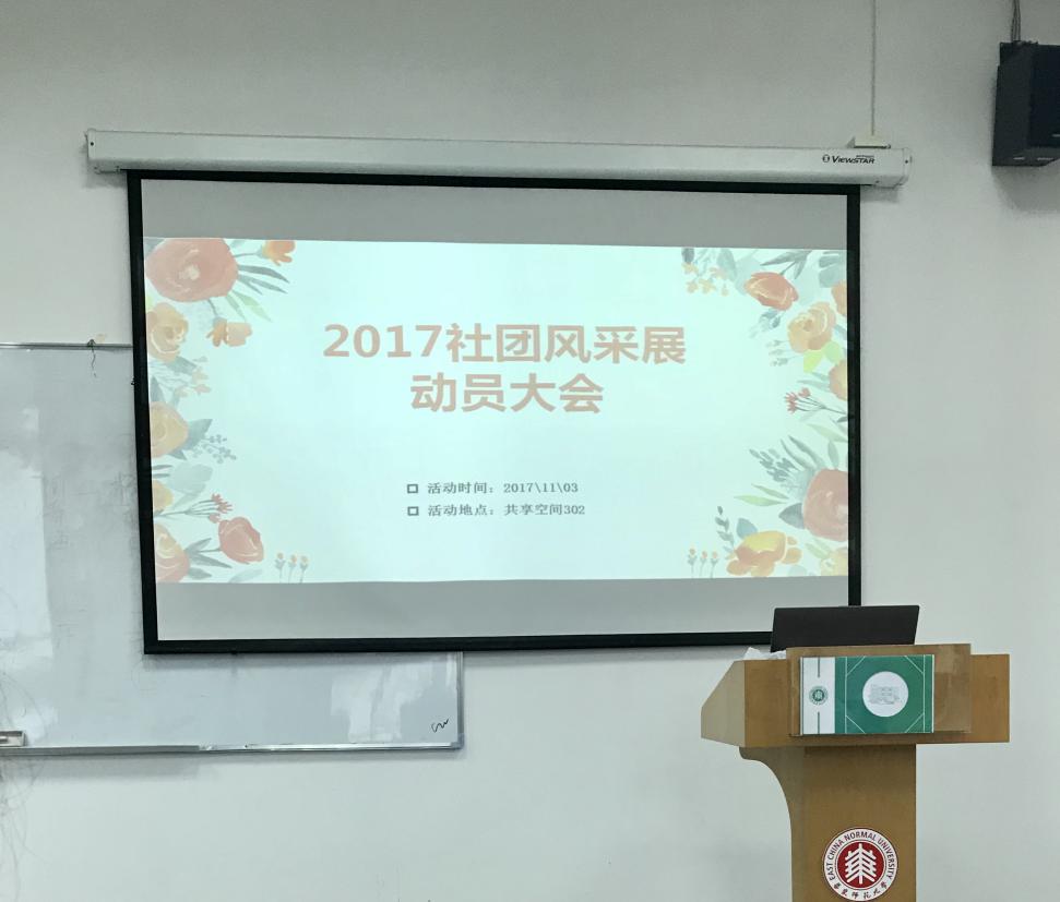 2017年11月3日下午四点,社团发展中心的社团风采展动员大会在学生共享空间302室顺利举行,会议由综合协调部副部长杜瑀主持。 深秋时节,天气渐渐变得寒冷,不过寒冷的天气也无法阻挡社团人的热情。为了给予各社团、志趣联盟、兴趣小组等展示自我的机会,展现他们阶段所获得的成果,既能让他们在他们的圆梦之旅上留下一笔美丽的印记,又能招揽更多志同道合的人共赴这趟充满魅力的旅程,社团发展中心开始筹备社团风采展活动。为了更好的展开工作,特展开此次会议。会议开始我们有幸请到社团发展中心指导老师刘佳老师发言,刘佳老师激励大家积极开展社团风采展的工作,但同时要记得不要因为工作而忽略学习,两手都要抓。接下来是社团发展中心主管冯桐华讲话,动员中心成员积极参与,把握机会展现自我锻炼自我。大家参与工作的热情立即被调动起来,积极参与各项工作安排。最后,由杜瑀同学介绍了社团风采展的主题、讲述了社团风采展工作的一些具体安排。在现场组织进行了主持人的报名,鼓励大家把握机会积极展示自我,最后为大家发放了精心准备的小礼品。 刘佳老师讲话 会议主持 此次动员大会高效有序地对本学期社团发展中心举办社团风采展工作做出安排,充分调动每个人的参与热情。相信大家一定会以百分百的热情投入工作,为同学们举办一场精彩的活动。