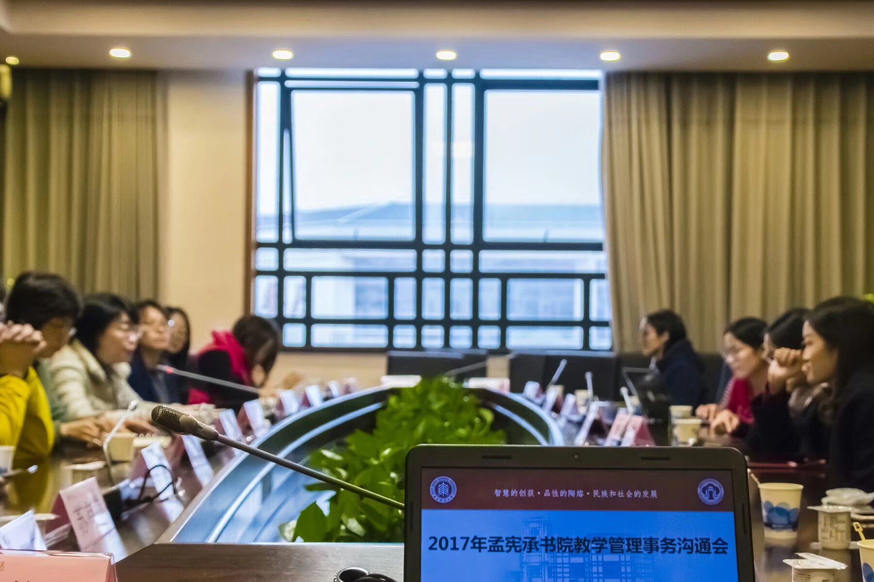 会上,吴薇院长首先代表书院对教务处老师以及专业院系教务员们的到来表示欢迎,并感谢各位老师一直以来对书院工作的指导与支持。随后,会上聆听了学业指导办公室关于书院各专业期中学情的简短汇报,就各年级、各专业书院辅导员团队所掌握的整体学风、课程学业表现、学业压力以及困难课程进行说明。孟宪承书院本学期以来辅导员团队狠抓学风,整体学情良好,新生学习积极性高;老生自主学习能力有所增强,整体学习投入较高。但仍存在部分困难课程,如新生学术英语听说,老生理科专业部分难度较大专业课程学生压力较大。书院方面也在帮助学生寻找原因,尽力做好学业帮扶工作。