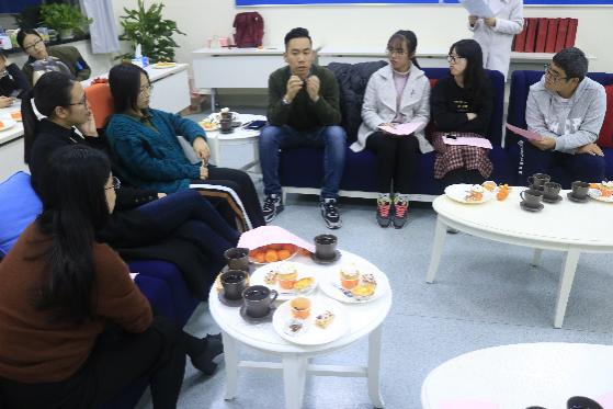 图为“传播东方智慧,文化润泽心灵”组分享实践心得 其中有许多组的活动生动有趣,令老师也心向往之。一些有创意的想法更是备受好评。像在“鸿雁载梦2.0”项目组中,负责人生动有趣的介绍让老师们都有点心驰向往,提出了嫁接项目的建议,想要在接下来的项目中也能享受这些有趣也有意义的活动。