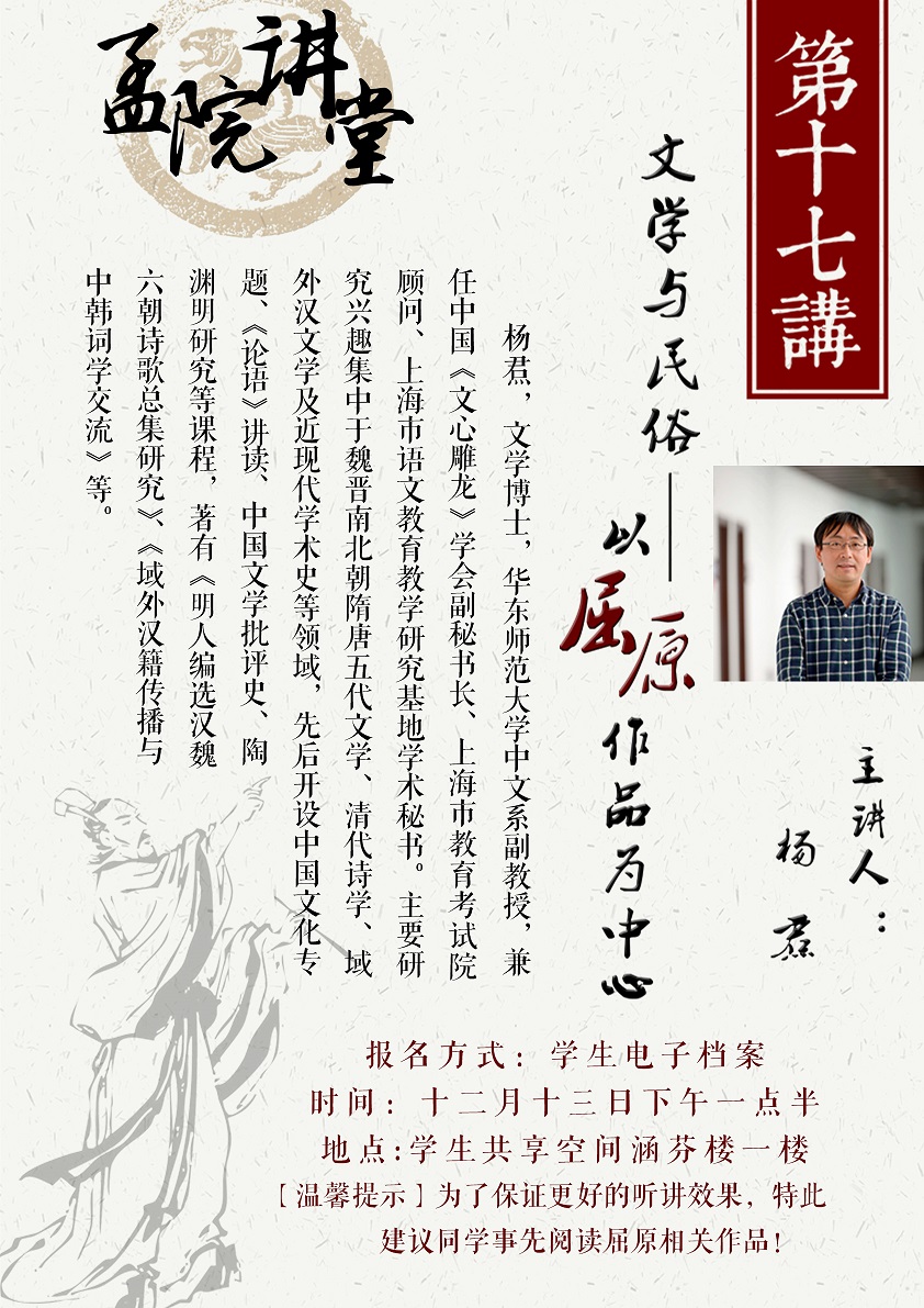 何处招魂,香草还生三户地;当年呵壁,湘流应识九歌心。 哀怨托离骚,生而独开诗赋立;孤忠报楚国,余风波及汉湘人。 提及屈原,脑海中必有高中背诵的《离骚》《思美人》——起伏回宕、一唱三叹的韵致,参差错落、灵活自由的语言形式,富于生气和感染力的诗歌风格,都令我们难以忘却。 卓绝一世的屈原经典作品,竟与民俗文化也有着众多不为人知的联系。欲知详情?本期孟院讲堂,邀你与杨焄老师一起,同回两千多年前的战国,以屈原的视角去体味那时的民俗风情! 小贴士:为更好地理解讲座内容,可提前阅读熟悉屈原相关作品。 【时间】:12月13日(星期三)13:30 【地点】:学生共享空间一楼涵芬楼 【报名方式】:电子发展档案——项目报名 12月13日,风里雨里,涵芬楼等你,快快行动起来吧! 文:杜小寒
