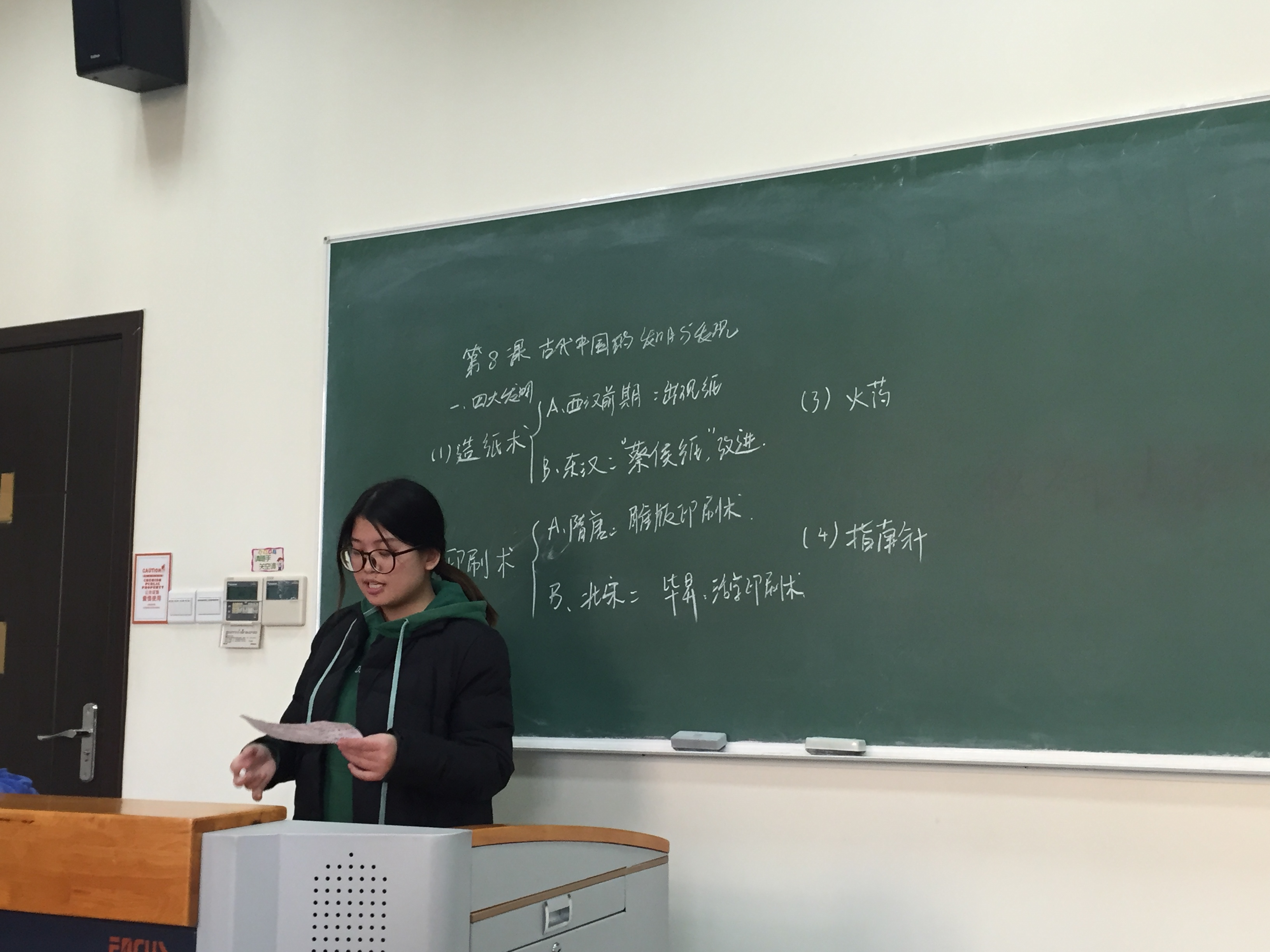 教师资格证面试的流程大致如下:一共有三位评审老师。在面试前,考生先抽取说课的题目。题目为课本中的一目的正文部分,考试根据所给的材料准备二十分钟。首先,三位老师会直接询问考生两道有关于教育学知识的问题,时长五分钟。之后再进行说课环节,时长十分钟。评审老师根据说课情况,可能会对考生提问。 12月12日恰好是教师资格证笔试成绩查询日。在面试环节开始之前,李老师首先询问了同学们的笔试通过情况。大部分同学都如愿以偿地通过了笔试。 本周模拟面试的两位同学分别是史慧玲同学和黄滢同学,评委分别为李老师和上周说课的韩俊杰同学、史媛同学。两位同学在面试前均抽取了各自的说课题目。 史慧玲同学回答的两个教育学问题分别为“有一个住读生下晚自习后乘门卫不注意,溜出校门上网吧。你得知这一情况后,准备采取什么措施来处理?”,以及“学生张强父母离异,远离同学的交往圈子,喜欢独来独往,不愿参加集体活动,他的性格有什么缺陷?你将怎样帮助他纠正?”历史说课题目则为《古代中国的发明和发现》中的《四大发明》一目。