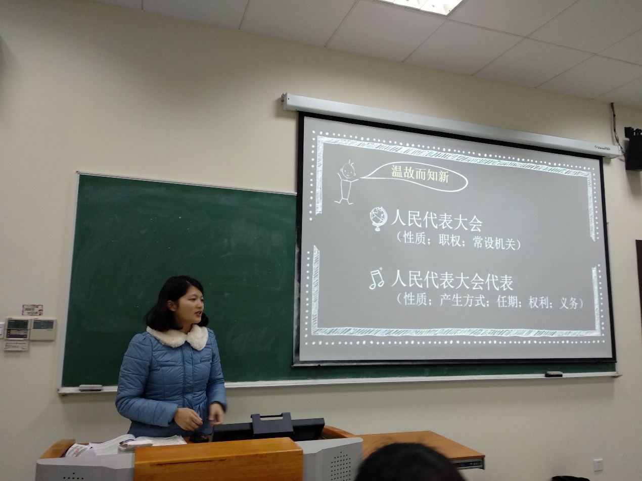第二位主讲人是彭鹏同学。彭鹏同学此次授课的主题是《人民代表大会制度》,是大家公认的较难讲解的一课。彭鹏同学首先带着学生温习之前所学过的人民代表大会以及人大代表等相关知识引出今天所要讲解的人民代表大会制度;其次通过视频导入,提问学生什么是人民代表大会制度;接下来区分了国体与政体的区别,并以表格的形式解释了民主集中制的概念;然后讲解了人民代表大会的优势;最后用材料体对本节课的内容进行复习。总体上以是什么——为什么——怎么做的逻辑顺序进行讲解。